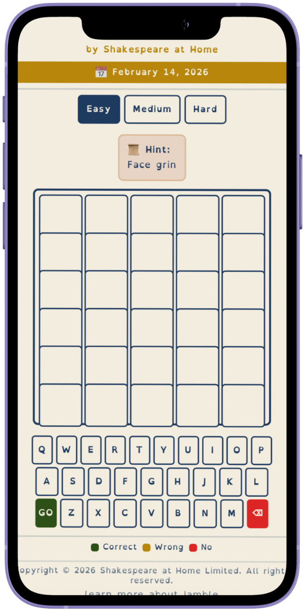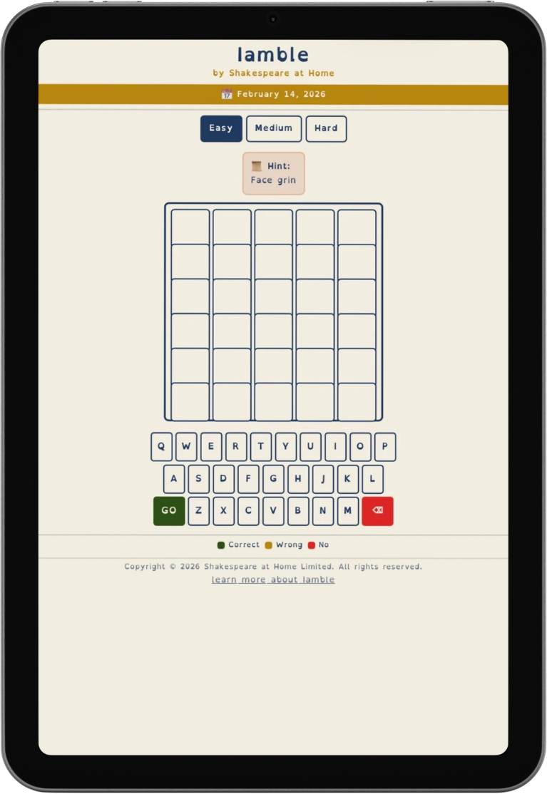Iamble (derived from Iambic pentameter) created by SAH, we believe, is the first online word game that is both dyslexia-friendly and centred around the text of Shakespeare. We are still in the beta phase, aka making it up as we go along. We hope you enjoy it.